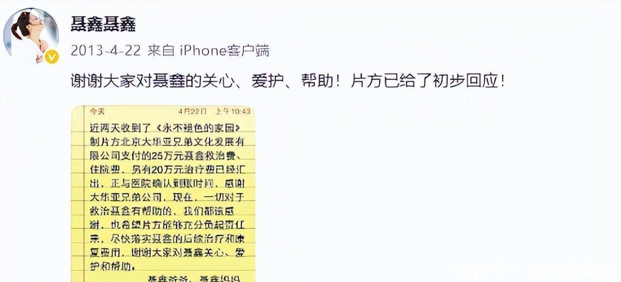 剧组的制片方倒是挺迅速的,不一会儿就支付万的医疗费用。不过,这点钱算啥呢,只要聂鑫还没完全康复,每天都还得花医疗费。过了两个月,她父母又发帖子跟剧组要钱,不过这次对方没答应。